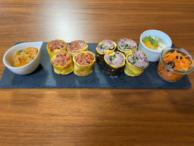左から2番目と3番目)「レンジでかんたん!! 薄焼きたまご」で作ったケチャップライス巻きとツナマヨとキュウリののり巻き。