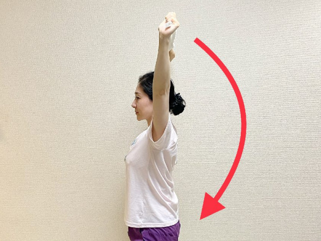 (1)タオルの両端、または肩幅より少し広めの場所を持ちます。そのまま両手をまっすぐ天井方向へと上げます。辛い場合は、長めのタオル、または紐を使用してください。