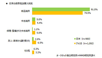 調査対象者のうち、スマートフォン・携帯電話を所有している男女(日本:980人、アメリカ:1092人)に、現在利用している端末の購入・入手方法を尋ねた質問では、「新品の端末を購入した」が日本で91.0%、アメリカで79.9%で、中古端末(修理・整備された中古端末を含む)を購入した人が日本で6.1%、アメリカで10.4%を占めている。