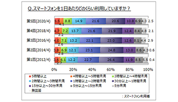 調査結果によれば、スマホを1日に1時間以上利用している人は5割強に達した。また、2時間以上利用しているという人が増加しつつある。