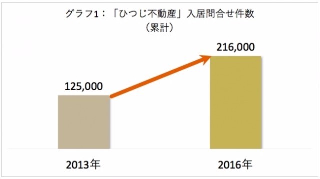 株式会社ひつじインキュベーション・スクエアが運営しているシェアハウス総合プラットフォーム『オシャレオモシロフドウサンメディア ひつじ不動産』がおこなった調査によると、2013年の入居問い合わせ件数(累計)が10万件だったのに対し、2016年末には20万件を突破。