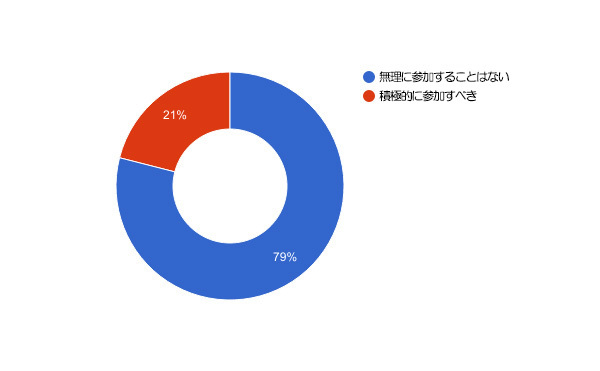 PTAに関して、アンケートでは、79%の方が「無理に参加することはない」と答え、「積極的に参加すべき」と回答した方は、21%でした。