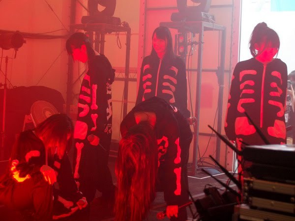 さて、ひめキュンのメインステージ後に少し休憩を取った後には、灼熱というか蒸し風呂の第2ステージへ。様々な話題を撒き散らす「BiS」や(メインステージのレポを後ほど!)、前編で御紹介した「OS☆U」と、人気グループが続いてました。テントの中もすごい人!そんな灼熱のステージに、ひめキュン降臨!今度はスカルスーツで登場なんですが、先ほどと全然衣装コンセプトが違うのにまたもやカワイイ!っていうのがさすがの美少女揃い。今回はロックチューン『例えばのモンスター』からはじまって、シリアスというよりも楽しさを前面に押し出したステージだったんでした。でも、どっかで、なんかものすごい強い感情がほとばしってるんですよ。今のひめキュンって、Negiccoの『圧倒的なスタイル』や、LinQが『祭りの夜』で見せる、いわゆる多幸感、ふわぁーっと温かくなるような感じとは、全く逆のベクトルに心が振れるんです。胸をかきむしられるというか…。一緒に見ていた方は「今のひめキュンって、エモいんですよ!」と力説しておられました。なるほどー、「多幸感」の逆ベクトルとして「エモ」って概念を置くのも面白いですね。