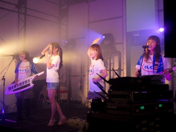 さてさて、そのままメインステージを取材しようかなぁ、と考えていたんですが、先ほどの休憩時間にですね、偶然「blue chee's」の皆様と接近遭遇!写真を一枚撮らせていただいていたんですね。このblue chee'sさん、90年代末期を駆け抜けたフジテレビ主導型アイドル、チェキッ娘から生まれたバンド、chee'sが再結成したグループなんです。チェキッ娘、覚えてます?関東ローカル番組だったんですが、「DAIBAッテキ!!」っていう、夕ニャンとかパラGOとかそういう流れの夕方バラエティ番組!フジテレビが送るグループだと言えば、アイドリング!!!につながってますし、秋元康さんが関わった、という意味ではAKB48につながります。まぁともかく、由緒正しいグループなんですよ。しかも今回は元チェキッ娘の矢作美樹さんがゲストボーカルに!タイムテーブルがずれて、おお、ちょうど取材できる!というわけで、第2ステージに登場のblue chee'sを取材にハシルッ!!
