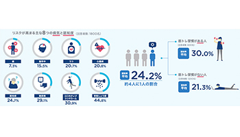 また、普段から筋トレの習慣がある人とない人で比較すると、筋トレ習慣がある人の認知率の平均が30%なのに対して、筋トレ習慣がない人が平均で21.3%と大きな開きがあることもわかった。このままこれらの健康リスクに対し、正しい理解がされないと、「重大疾患予備軍」、ひいては「発症者」が増えることも予想される。