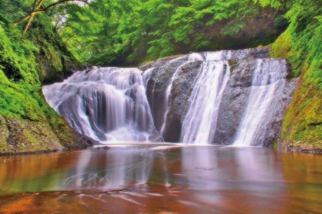 袋田の滝を仰ぎ見る吊り橋を渡って、約20分。ハイキングコースにもなっている袋田自然研究路を歩いていくと姿を現す、もうひとつの滝。白い布を干したようとも形容される。