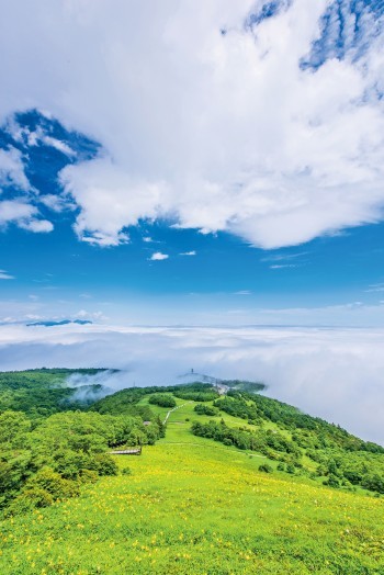 3月下旬のマンサクから始まり、4月から6月にかけてはカタクリ、ツツジ、その後ニッコウキスゲなどが咲く高原。天候により、花と雲海のコラボレーションも楽しめる。
