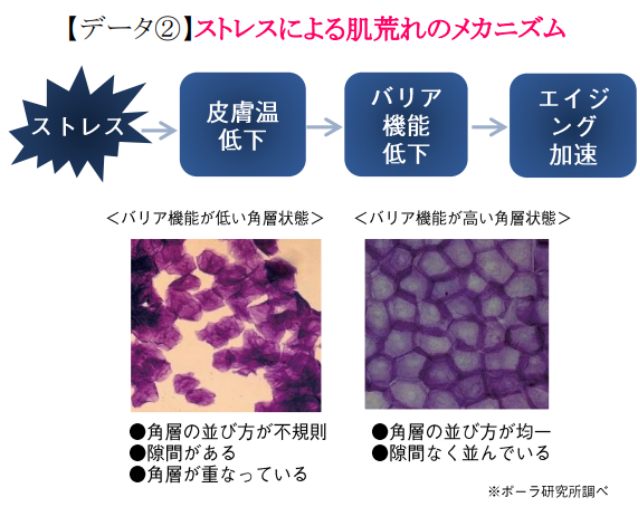 図にありますがストレスによって、皮膚温度・バリア機能が低下します。そのため、角層が乱れ、肌がごわつき美容成分が浸透しにくい状態になってしまい、肌が荒れ、普段のスキンケアまでもが合わなくなってしまうのです。それだけでなく、肌の老化までもが進んでしまうことに……!