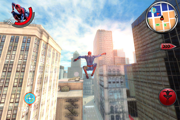 ウェブスイングでの移動は非常に快適です。正直、仮想スティックでの移動は若干やりにくいというか、最初は細かい動きをするのに慣れが必要です。長距離を移動するときはウェブスイングだけでいいのですが、目的地が近くなるとどうしても歩く必要が出てきますからね……。