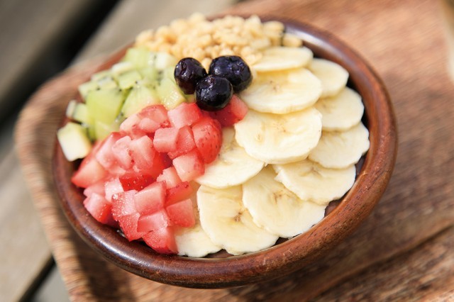 写真のアサイーほかスムージーは700円。ドーナツは200円〜。材木座海岸は逗子にも近く、マリンスポーツのメッカとして南国気分に浸れる。