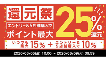 au PAY カードで決済すると還元率がアップする総合ショッピングモール「au PAY マーケット(旧au Wowma!)」は、買い回りキャンペーン「還元祭☆ポイント最大25%還元」を実施する。キャンペーン期間は2020年6月5日10時~6月9日9時59分。