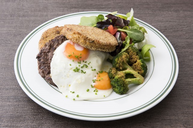 プライムグレードの100%ビーフパティ280g、グレービーソース味のクリスピーベイクドリゾットとフライドエッグの相性が抜群です。