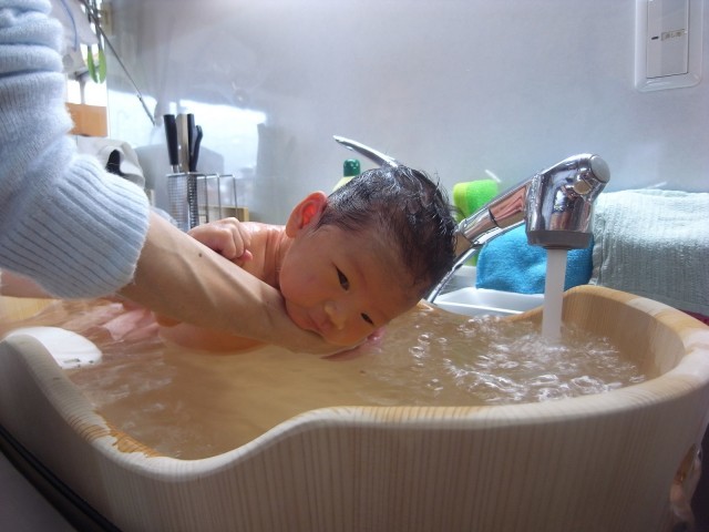 調理台やテーブルにタオルを敷いてスタンバイすれば、ひとりでもスムーズに沐浴させてあげることができます。お風呂場でかがんだりする必要もないので、腰への負担も減りそうですね。