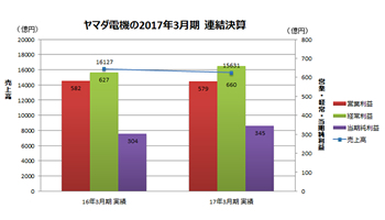 ["\n ヤマダ電機は、5月10日、2017年3月期(16年4月~17年3月)の連結業績を発表。売上高は約1兆5631億円(前年同期比96.9%)、営業利益は約579億円(同99.5%)、経常利益は約660億円(同105.3%)、当期純利益は約345億円(同113.6%)で減収経常増益となった。