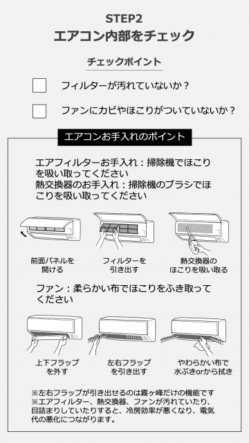 エアコン内部は、やっぱりフィルター掃除が不可欠。掃除機を使って埃を吸い取りましょう。丸洗いできるタイプの場合は、洗ってよく乾かしてからセットしましょう。