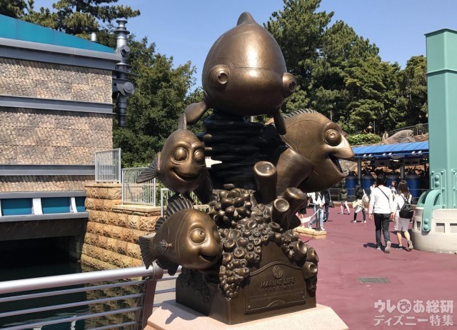 アトラクション入り口の近くには、ニモやドリー、そしてゲストが乗るシーライダーをかたどった銅像が置かれています。