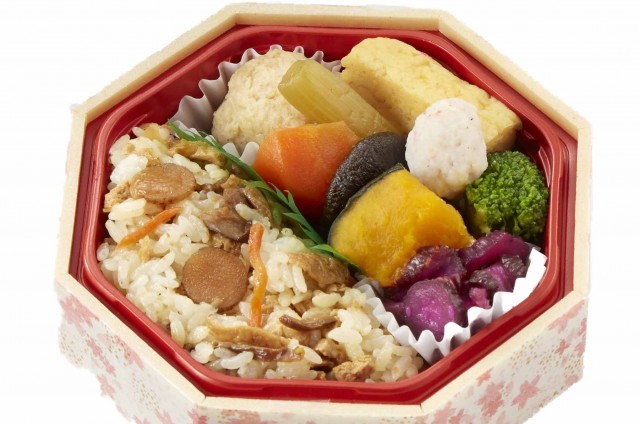 佃浅自慢のおかずを盛り付けた、食べきりサイズの五目ご飯弁当です。