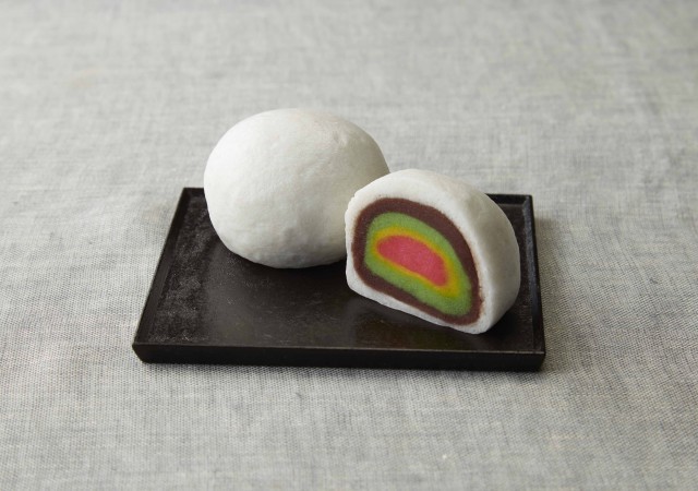 2つに割ると、水面に広がる波紋のような餡と生地の5色のグラデーションが現れる、凝った作りのお饅頭です。