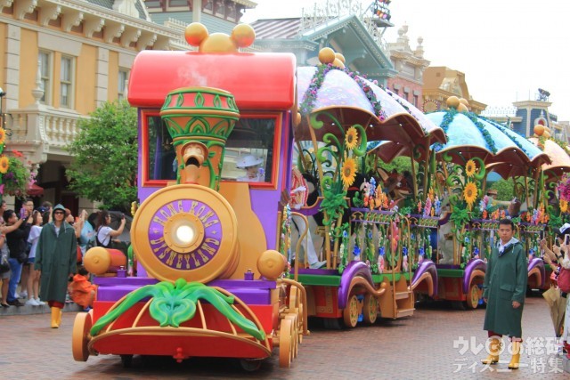 晴れの日のパレードでは徒歩で現れるキャラクターたちが、一同にフロートに乗っているので、雨の日は雨の日でとっても豪華なパレードになるんですよ。