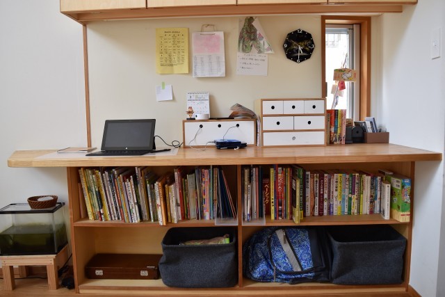 2階に子ども部屋がありますが、絶対上には持っていかない。だから下(1階)に置き場を作って、帰ってきたらすぐにしまえるようにしています。