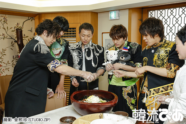 任命式の後はボイメンがビビンパ作りに初挑戦! 料理上手の小林ではなく、今回は、勇翔と平松が味付けを担当。先生が目の前で実演してくれ、見よう見まねで具材を投入し、混ぜ合わせます。出来上がったビビンパの味をたずねられると「マシッソヨ~!」(吉原)と得意の韓国語で知事と会話を交わしていました。