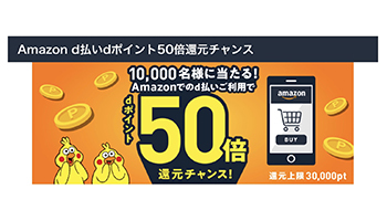 NTTドコモは、抽選で最大dポイント3万ポイントが還元される「Amazon d払いdポイント50倍還元チャンスキャンペーン」を実施している。キャンペーン期間は7月31日23時59分まで。