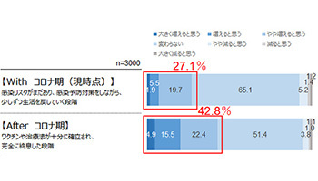調査では、新型コロナウイルス感染症の感染リスクがまだあり、感染予防対策をしながら少しずつ生活を戻していく段階(現時点)を「Withコロナ期」、ワクチンや治療法が十分に確立され、新型コロナウイルス感染症が完全に終息した段階を「Afterコロナ期」としている。