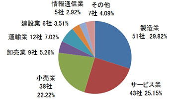業種別では、製造業が51社(構成比29.8%)で最多。グローバル展開する大手企業が多く、世界的な景気悪化の直撃に備え、資金調達額の合計は6兆6106億円と突出した。次いで、サービス業の43社(構成比25.1%、資金調達額6002億円)で、インバウンド消失や旅行自粛の影響を受けた宿泊・旅行業などが多い。
