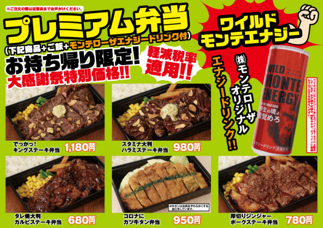 このキャンペーンにあわせて、新作の "肉食系ガッツリ弁当" と、同社が新発売したエナジードリンク『ワイルドモンテエナジー』をセットにした『プレミアム弁当』の販売が、テイクアウト限定で開始されました。