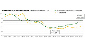 triplaは、同社が運営する宿泊施設の公式ウェブページ向け宿泊予約システム「triplaホテルブッキング」を利用している国内約300軒の宿泊施設における1月26日週~5月24日週の予約状況の集計結果を6月10日に公開した。