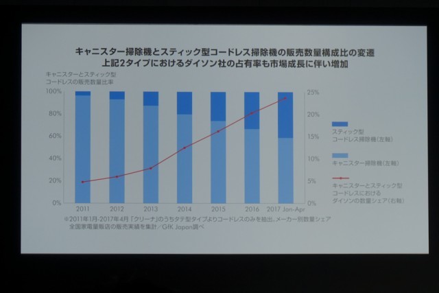 現在、日本ではスティック型コードレス掃除機がシェアの5割になろうかというほど、一般的になっています。そのなかで、ダイソンのシェアもアップ。「コードレス掃除機ならダイソン」と言ってしまってもおかしくはありません。