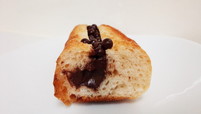 カカオバター72%のガナッシュクリームと粒々のパールチョコをたっぷり挟んだバゲットサンド。小麦の香りのするパンも美味しいし、ややビターなチョコも私の好みでした!! 半分でも十分満足できます。