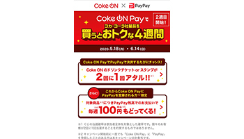5月18日にスタートした「Coke ON Payでコカ・コーラ社製品を買うとおトクな4週間」キャンペーンは6月14日23時50分をもって終了する。 au PAYまたはPayPayをCoke ON Payに初めて登録し、全国のCoke ON Pay対応自動販売機でコカ・コーラ社製品を買うと、毎週100円相当、au PAYの場合はPontaポイント、PayPayの場合はPayPayボーナスで戻ってくる。