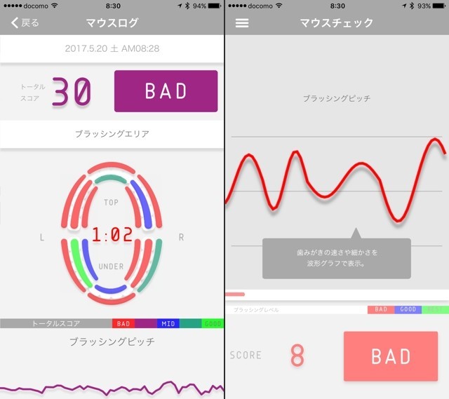 歯磨きの結果はデータとして保存され、磨いていないところ、磨いたところが一目瞭然。
