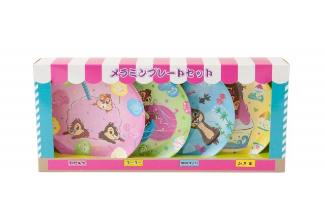 わたあめ、ヨーヨー、金魚すくい、かき氷を楽しむチップ、デール、クラリスのイラストがかわいいプレートセット。