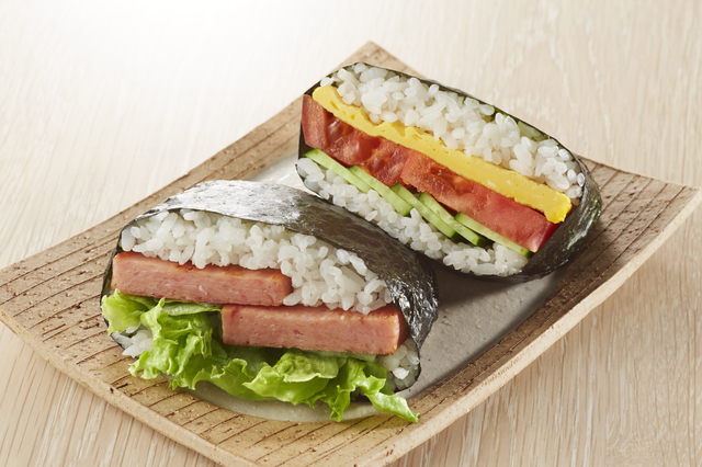 海苔と白米を用意するのはおにぎりと一緒。ラップの上に海苔を乗せ、その上にごはんと好みの具材を乗せたらにぎらずに海苔で包み込むだけ。半分に切って出せば断面もキレイでサンドイッチのようになります。