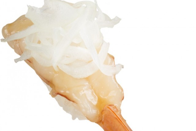ぷりぷりの食感が楽しい赤えびとカルパッチョソースを使用した『赤えび和風カルパッチョ』。あっさりと食べられる、和洋折衷の創作すしです。