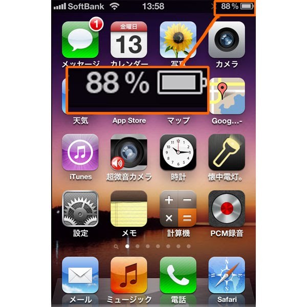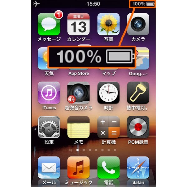 充電を満タンにした状態で、設定をいじらずに一時間放置したiPhoneのバッテリー残量です。(※バッテリーの減りには環境によって個人差があります。)