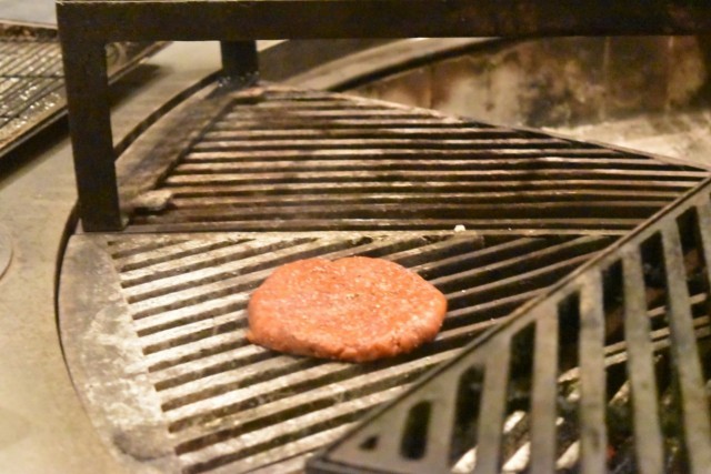 桜の木やチャコールを使用している焼き台で、パテとバンズをあぶり、薫風でスモーキーな風味にするなど、プロのシェフならではのテクニックを披露。