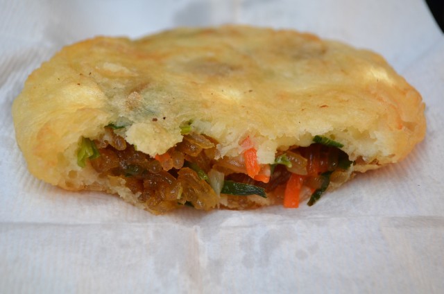 あつあつの生地をかじると少々脂っこく感じるが、具の春雨や野菜と口中で混ざり合うとちょうどいい加減になる。けっこうボリュームがあるので、2人でひとつが適量かもしれない。