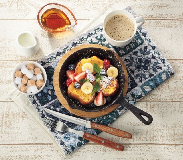 保温性が高く冷めにくい、使い勝手のよい鋳鉄フライパンで、そのままテーブルへ置いて、食卓の演出に一役買います。オーブンでも使用可能。19cm(799円)もあります。