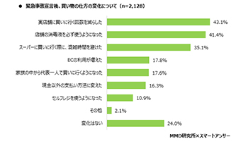 全ての調査対象者に、緊急事態宣言の発令以降に買い物の仕方に変化があったかを尋ねたところ(複数回答)、「実店舗に買いに行く回数を減らした」(43.1%)が最多で、「店舗の消毒液を必ず使うようになった」(41.4%)、「スーパーに買いに行く際に、混雑時間を避けた」(35.1%)が続いている。