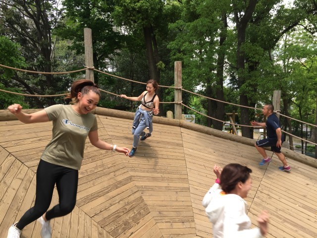 案外苦戦したのが、斜面になったクモの巣のような板のアスレチック。板の上を走りまわる姿はもう大人とは思えないくらいの、はしゃぎぶり。