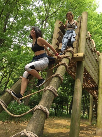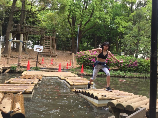 難易度高しの複合アスレチック。ネットを登り、ターザンロープ、さらには丸田渡りと、もう歓声が止まらない!