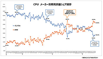 振り返ると、3年前の17年6月26日週は、インテルのシェアが83.9%で、AMDが16.1%に過ぎなかったが、2年かけてインテルを追い込み、19年7月に一気に形成が逆転した。