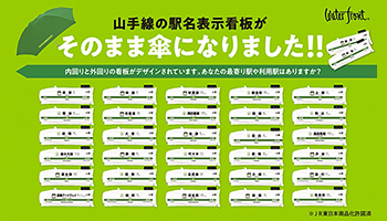 傘ブランド「Waterfront(ウォーターフロント)」を運営するシューズセレクションは、JR東日本リテールネットとコラボし、東京を代表する鉄道路線である「山手線」の駅名表示看板をデザインした折りたたみ傘「ポケフラット山手線駅名標傘」を山手線駅の「NewDays」「NewDays KIOSK」で6月26日に先行発売する。税別価格は1500円。