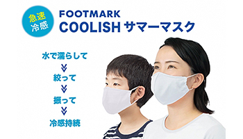 フットマーク クーリッシュサマーマスクは、これから暑さが予想される夏場のマスク対策として二層式の独自の冷感素材を使用したマスク。独自開発の3種類の糸が気化熱を効果的に発生させ、冷感効果を発揮する。一般的な接触冷感とは違い、水分(水、汗、お湯でも可)を含ませ絞って振ることで、何度でも生地温度が低下する。紫外線遮蔽率(UVカット)が98%、紫外線保護指数(UPF)が50+。洗っても機能性は変わらない。