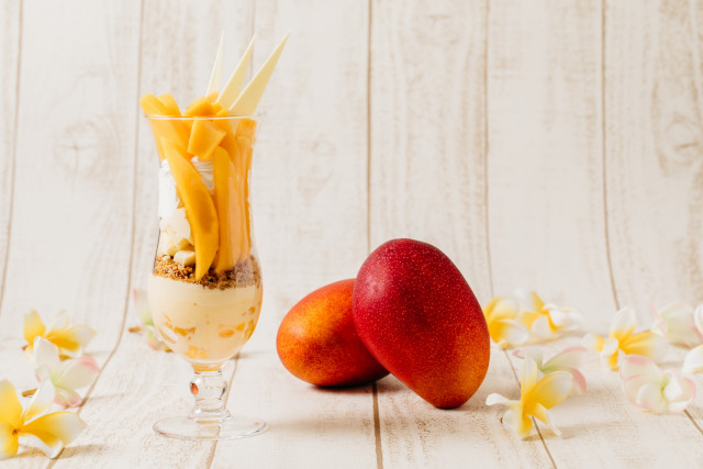 芳醇な香りと甘み、とろける食感が味わえる、“宮崎産完熟マンゴー”を使ったパフェ。