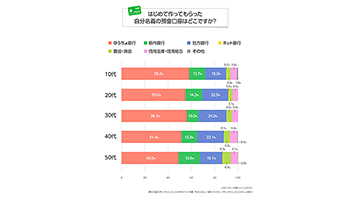 初めて自身で作った自分名義の預金口座はどこかを尋ねた質問では、10代で「ゆうちょ銀行」が3割超で最多だったが、20代以降で「都市銀行」「地方銀行」の割合が高い。