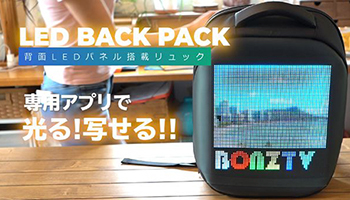LEDリュックサックは、背面に約4000個のLEDが付いたパネルを搭載し、スマートフォン専用アプリを使い自分で撮った写真や文字をリュックに表示できる今までにないおもしろリュック。専用アプリ「LED space」(iOS/Android)にツールをたくさん用意しており、文字や写真、GIFを使った動画など、さまざまな画像を表示することができる。